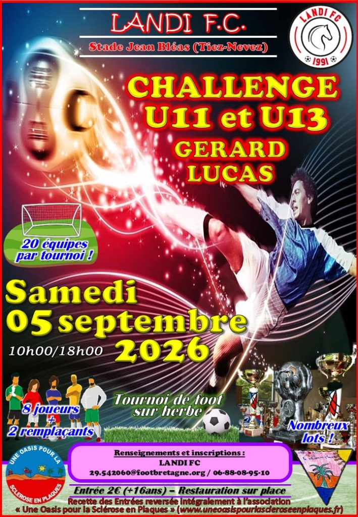Le Landi FC organise l’édition 2026 de son Tournoi U11/U13 (Challenge Gérard Lucas) le samedi 05 septembre 2026, de 10h00 à 18h00, au complexe sportif de Tiez-Nevez à Landivisiau.